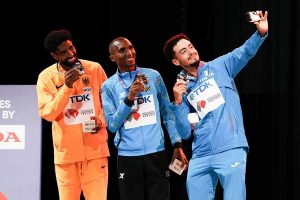 マラソン同タイム決着の2人がまた“並んだ” 死闘から9時間後、表彰式でシンブ&ペトロスが笑顔【東京世界陸上】