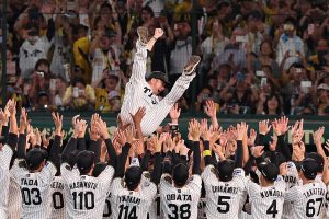 胴上げ直前…佐藤輝明が一目散に行動「ほんまに泣ける」 バッテリーの背後「絆ですね」