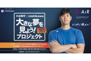 2025.07.17西川株式会社は16日、コンディショニングサポートをする米大リーグ・ドジャースの大谷翔平投手とともに、「大きな夢を見よう!プロジェクト2025」を開始すると発表した。このプロジェクトは、未来を担う子供たちの健やかな成長と夢の実現を応援する社会貢献活動。「エアー」シリーズのマットレス約2500本を、日本全国の小学生から大学生の団体に無償で提供する。