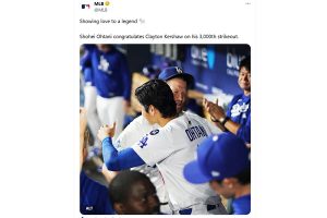 2025.07.03米大リーグ・ドジャースのクレイトン・カーショー投手が2日(日本時間3日)、本拠地でのホワイトソックス戦に先発登板し、通算3000奪三振を達成した。試合後、偉業を称えて贈られたオンリーワンの「記念品」にファンは仰天している。