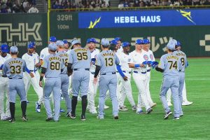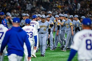 2025.03.15MLB東京シリーズのプレシーズンゲームは15日、東京ドームで行われ、阪神がカブスに3-0で勝利した。先発した20歳の左腕・門別啓人投手が5回パーフェクトの快投。5投手で完封リレーを飾った。試合後には両球団の選手がグラウンドで交流するシーンが発生した。