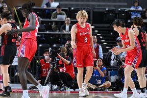 2026.04.12バスケットボール女子Wリーグのプレーオフ・ファイナル第3戦が11日、京王アリーナTOKYOで行われ、レギュラーシーズン2位のデンソーが同1位のトヨタ自動車に69-59で勝利した。2勝1敗とし、悲願の初優勝に王手。キャプテンの赤穂ひまわりを大怪我で欠く中、デンソー一筋18年目の高田真希を中心としたチーム力で緊迫した試合を勝ち切った。