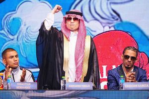 2025.12.26ボクシングの大型興行「The Ring V: Night of the Samurai(ナイト・オブ・ザ・サムライ)」に出場する選手たちが25日、サウジアラビアの首都リヤドで公式会見に出席した。前WBA&WBC世界フライ級統一王者の寺地拳四朗(BMB)は27日に、IBF世界スーパーフライ級王者ウィリバルド・ガルシア(メキシコ)に挑戦する。衣装をアップグレードさせて登場し「勝って次に繋げたい」と力強く意気込んだ。
