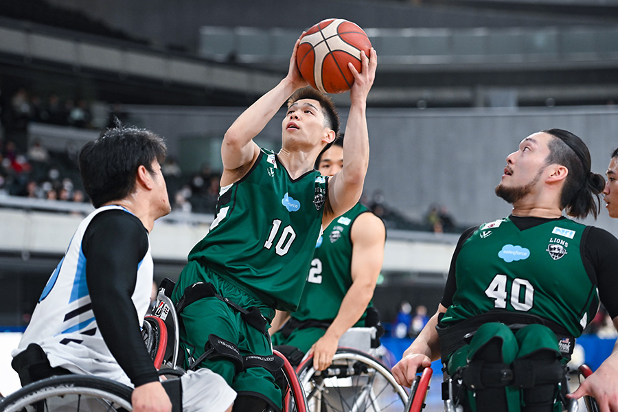 そんな魅力を収めたい。選手が目の前を通る瞬間をゴール裏から狙った。シュートを決められた埼玉の北風大雅(4.5)がエンドラインへ球を拾いに来た。3日間で4試合目。左腕のテーピングが疲労を物語った。すぐさま攻撃へ。近くまで写る広角レンズで収めたが、予想以上に勢いよく回った車輪は少しブレてしまった。