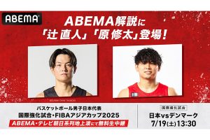 2025.07.15新しい未来のテレビ「ABEMA(アベマ)」は、男子バスケットボール日本代表のアジアカップ直前の強化試合・デンマーク戦を19日午後1時より無料生中継。元日本代表で現役Bリーガー・辻直人(群馬クレインサンダーズ)、原修太(千葉ジェッツ)の2名が解説者として出演すると15日に発表した。