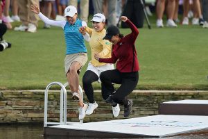 2025.04.29米女子ゴルフのメジャー初戦・シェブロン選手権は27日(日本時間28日)、米テキサス州のカールトンウッズ・クラブ(6911ヤード、パー72)で最終日を行った。23歳の西郷真央(島津製作所)は通算7アンダーで並んだ5人のプレーオフを制し、米ツアー初優勝を遂げた。激闘後、大会優勝者の恒例となっている池へのダイブを敢行。西郷たちの笑顔が弾けたが、水中では思わぬ事態が起きていた。