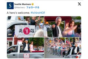 2025.07.27大リーグ通算3089安打を残し、日本人初の米野球殿堂入りが決まっているイチロー氏(マリナーズ会長付特別補佐兼インストラクター)の殿堂入り表彰式典が27日(日本時間28日)に行われる。前日の26日(同27日)には米ニューヨーク州クーパーズタウンで行われた祝賀パレードに参加した。弓子夫人とともに車に乗り込み、ファンの声援に応えた。球団公式Xが様子を伝えている。
