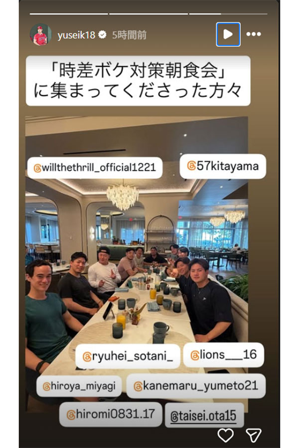 侍ジャパンの「朝食会」公開 移動13時間超…早速「時差ボケ対策」 菊池、宮城ら交流の場 2026.03.12 著者 : THE ANSWER編集部 キーワード : 侍ジャパン Twitter Facebook B!Bookmark 【画像】侍ジャパンで開かれた「時差ボケ対策朝食会」の写真 こちらもオススメ▶︎大谷翔平&妻の機内2ショットをカメラマン公開 隣席で顔を寄せ合い…悶絶ショット (THE ANSWER編集部)