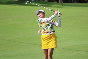 原英莉花、ミニスカ&ルーズソックス風「かわいいウェア」で魅了 「27歳頑張ります」12アンダーで4位